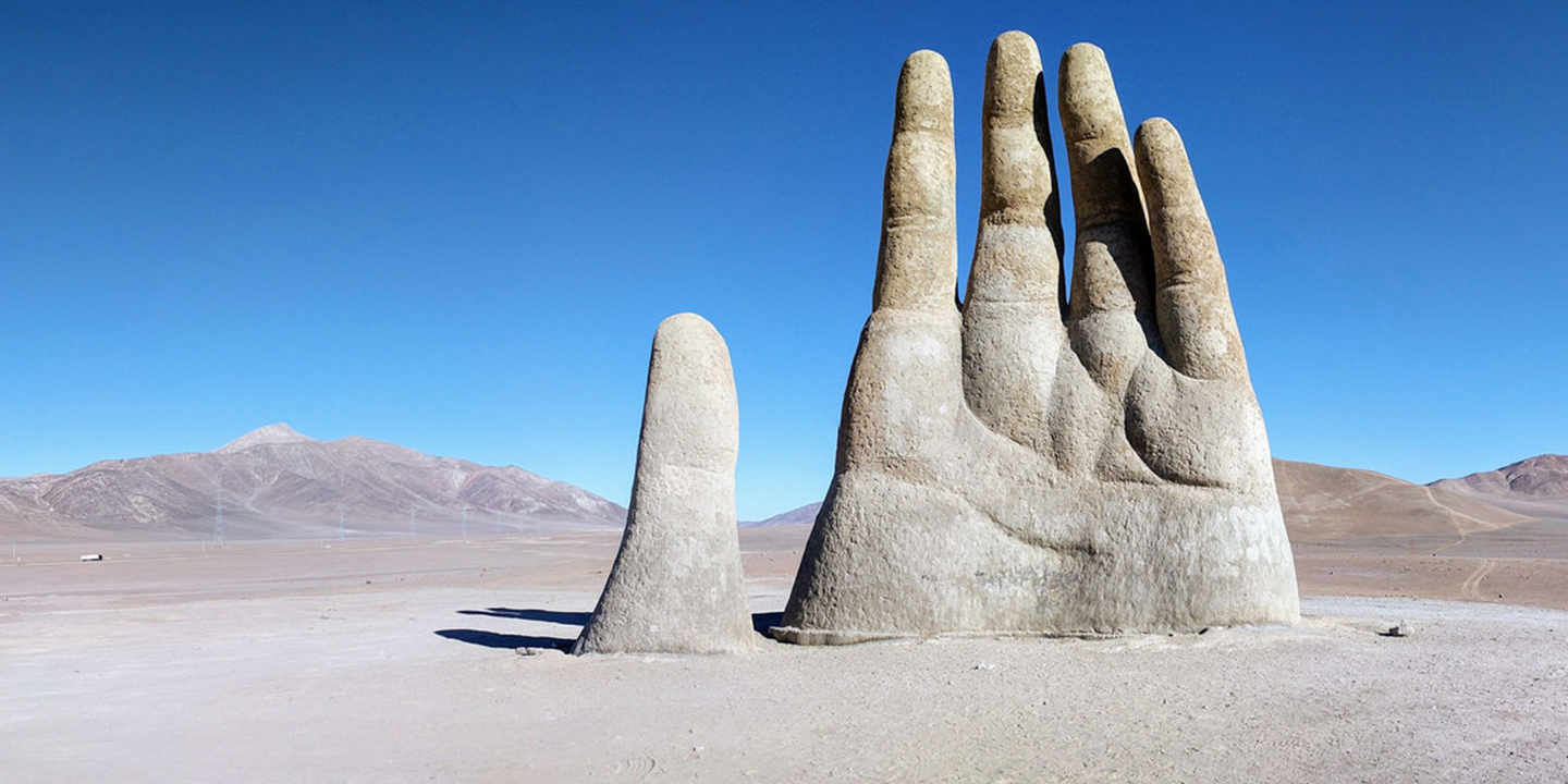 There's a giant hand in the middle of the Atacama Desert. Why? It's a high five from the people of Antofagasta, Chile. The hand rises 36 feet out of the sand and can be seen for miles waving at visitors from the barren expanses of the desert. Strangely, there is an opposing hand located 1,200 miles away in the Atlantic coastal resort of Punta del Este. The sculptor called it Man Emerging to Life, the locals call it Monument to the Drowned or just, The Hand.