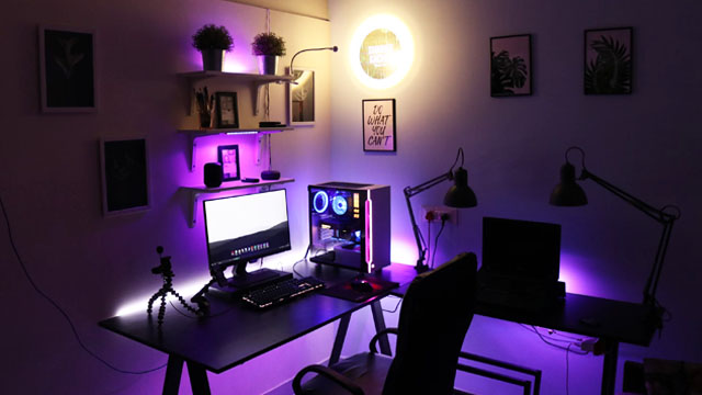 Coloque algumas tiras de iluminação RGB na parede ou na parte inferior da sua mesa e adicione um ambiente ao seu setup de jogos. Você pode mudar as cores com base no seu humor ou sincronizá-las com o seu sistema para uma experiência ainda mais imersiva.
